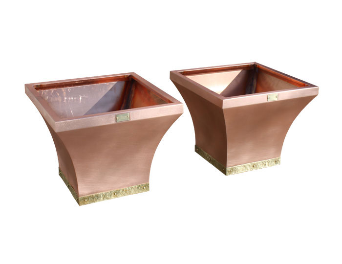 We get all sorts of requests for custom pots and planters for the garden. This example features a solid copper pot with hammered brass accents. We can achieve any architectural style you're after. Send us a photo and we can recreate it with any metal you want.