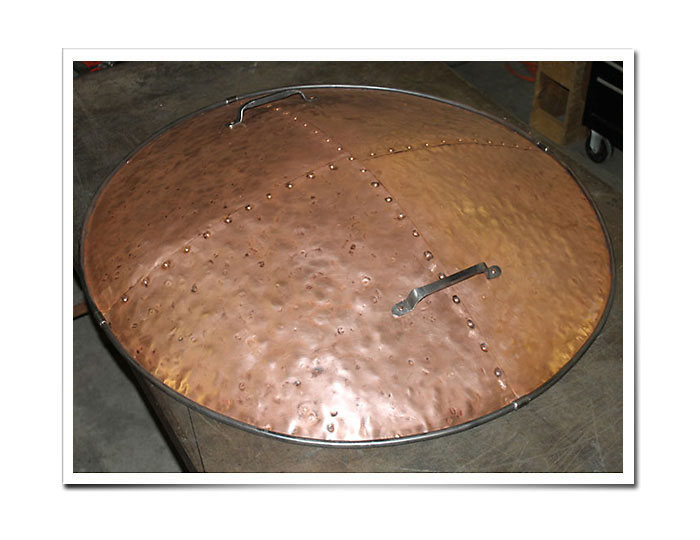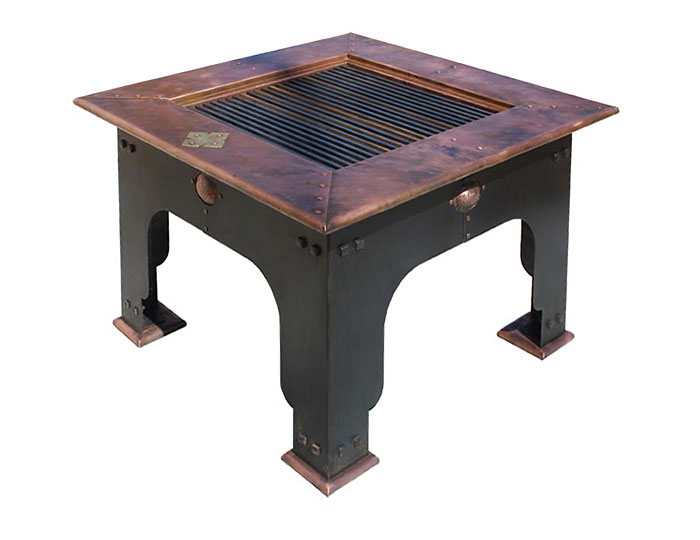 This custom fireplace cover in distressed copper and a forged stainless steel bar will surely outlast everything else in their backyard. This is a great solution for the popular kettle fire pits and can be made in a square or rectangle for modern natural gas fire pits.
