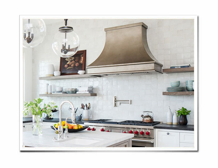 The Falkner range hood is one of our most popular designs. With its concave body shape and hammered apron, this look can serve most kitchens well. The Falkner is a classic shape that works very well on its own, as you can see in some of the photos to the left.
